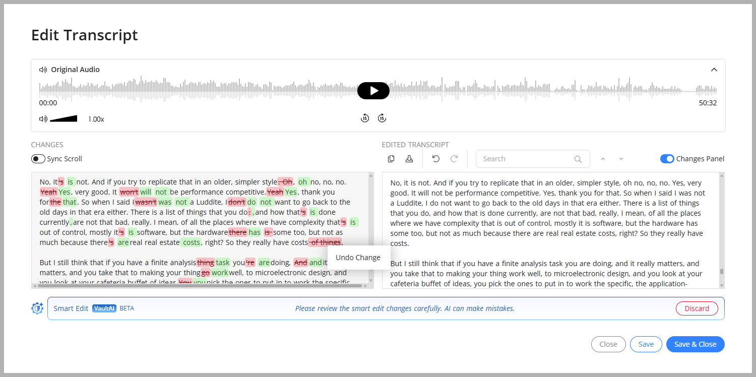 Vault AI to summarize, transcribe, and smart edit transcripts.