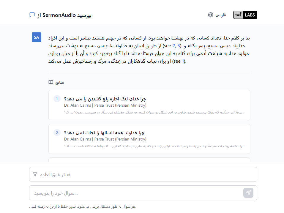 Something experimental that we're working on. Ask it anything, in any language. All answers are grounded with sermons that have opted-in to our new ASK feature. Tell the people of Iran that they can get real BIBLE ANSWERS soon!